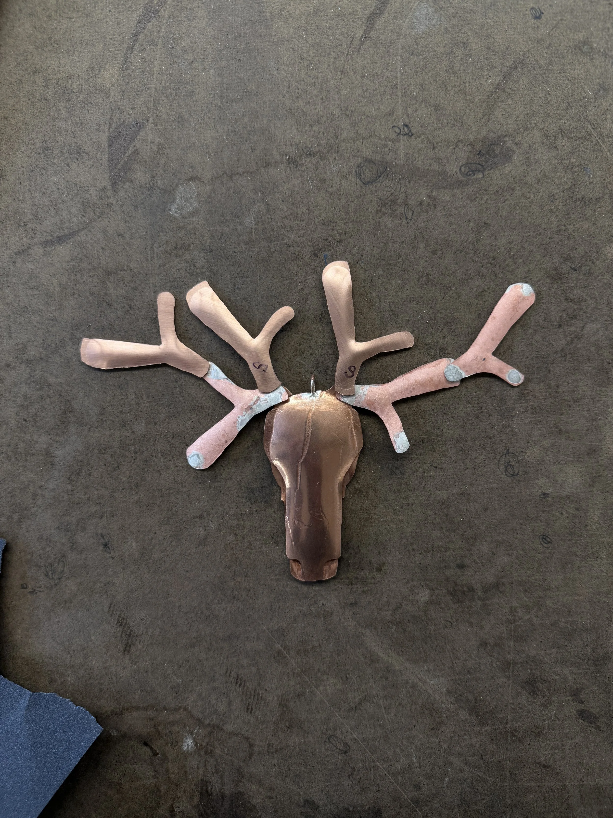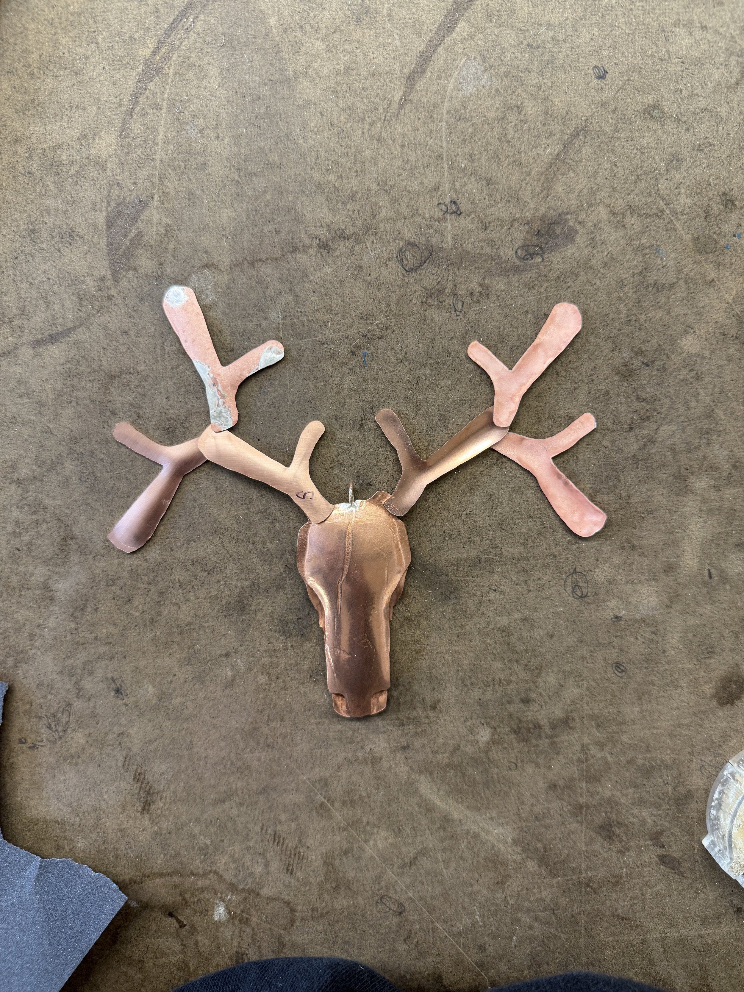 Initial skull design; I wanted to shape the copper by hand + hammer, however, the copper didn’t form the way I wanted to (you can see the visible warping).