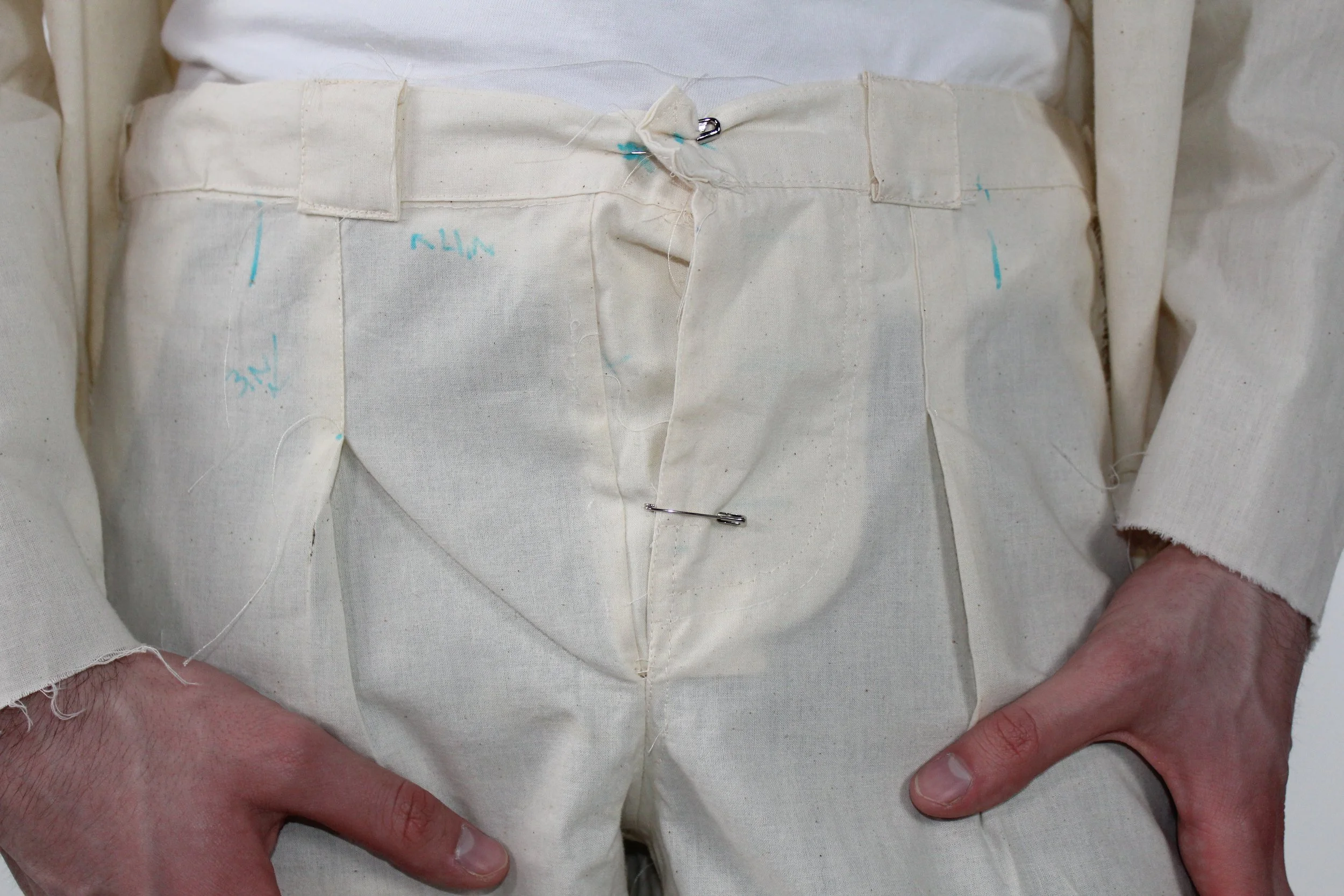 Moving onto the toile pants, it was much more quicker process. I had made pants previously and had some knowledge of how to pattern the pants. The issue I ran into was the fly height, I had made it too small so the pants are more of a mid-rise than a high rise. For the toile's technical aspects, I used a safety pin closure for the fly and did not include pockets. I also had marked with blue marker where my adjustments will be made for the repattern going into iteration 3.