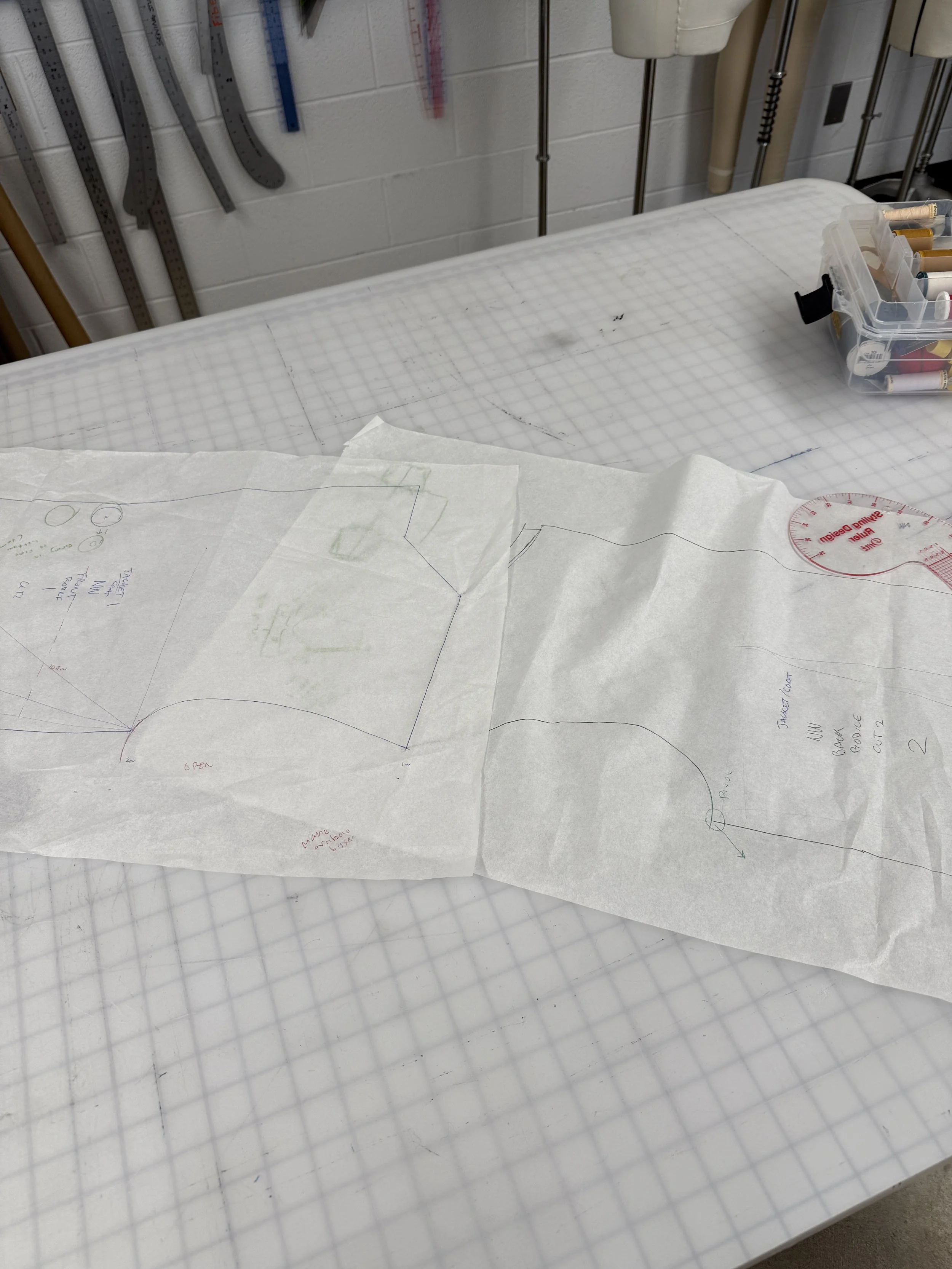 With the jacket, it was incredibly tedious readjusting and repatterning the sleeves. I found it to be the most challenging aspect of the garment. I had to repattern three times due to sleeve cap height being off, too far forward, and being too narrow. Another aspect I learned during the process of the jacket is how to properly create a lapel.